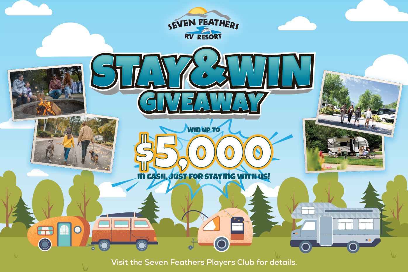 Win up to $5,000 in cash just for staying with us! From November 1 through February 28, Stay & Win at Seven Feathers.